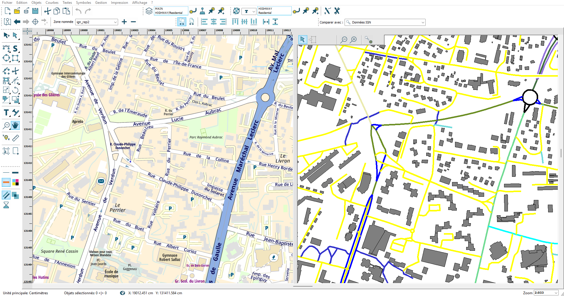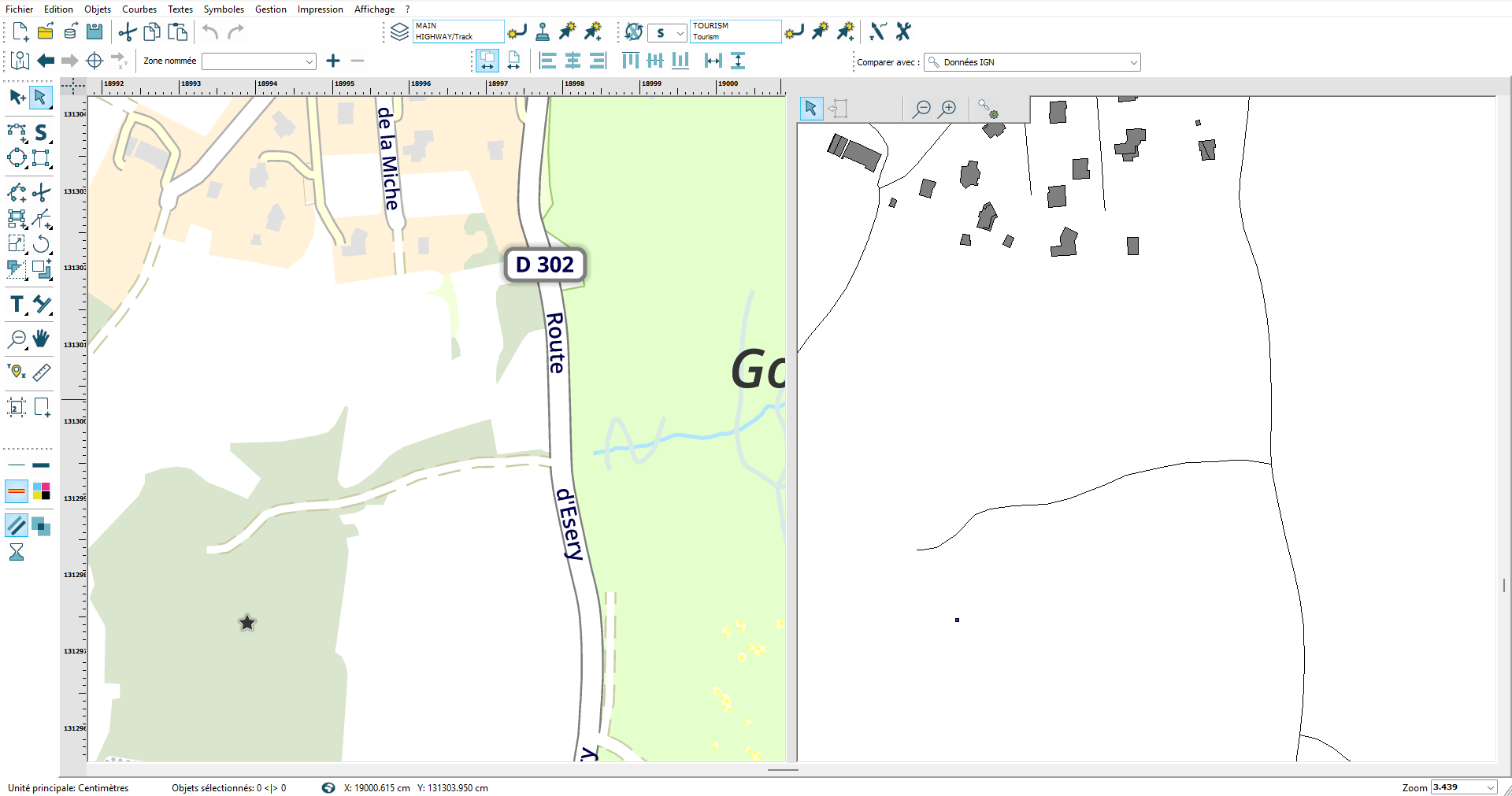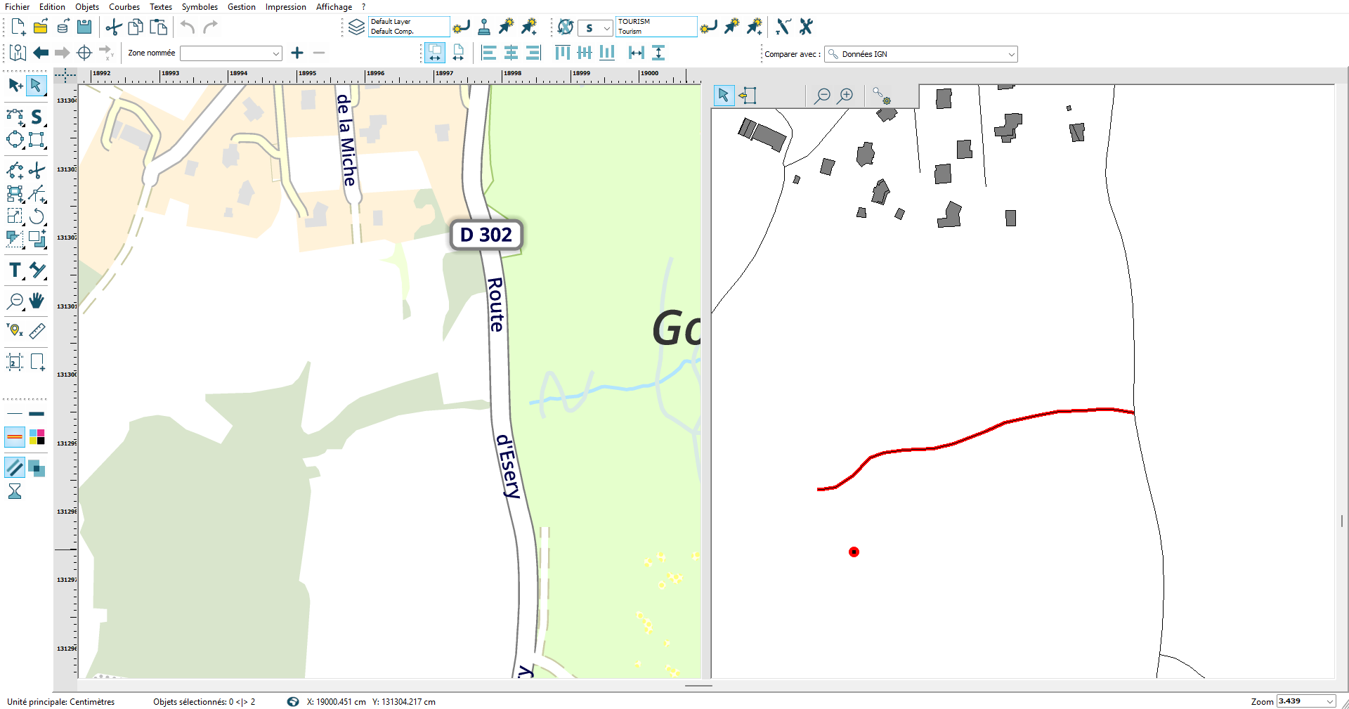 Dans l’exemple suivant, on distingue entre autre un point et une polyligne (route) dans les données IGN affichées à droite qui n’ont pas leur équivalent :