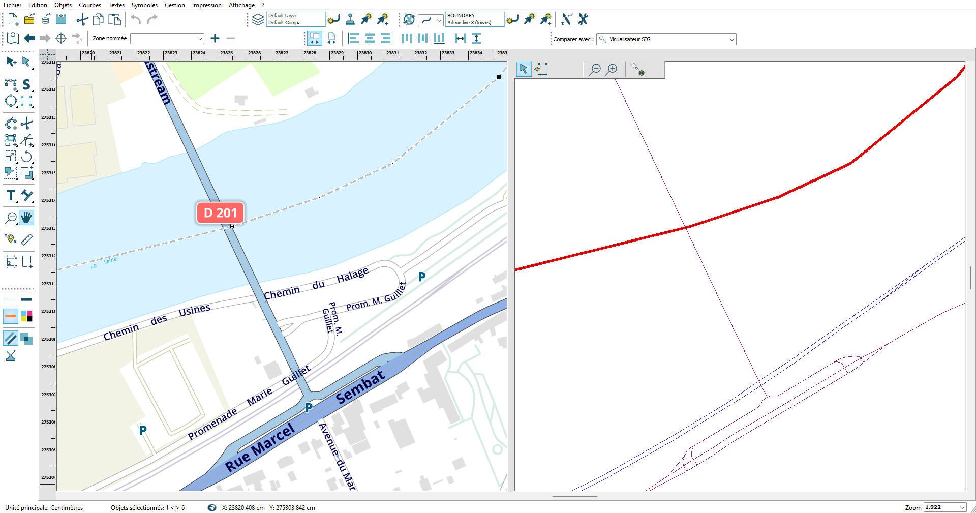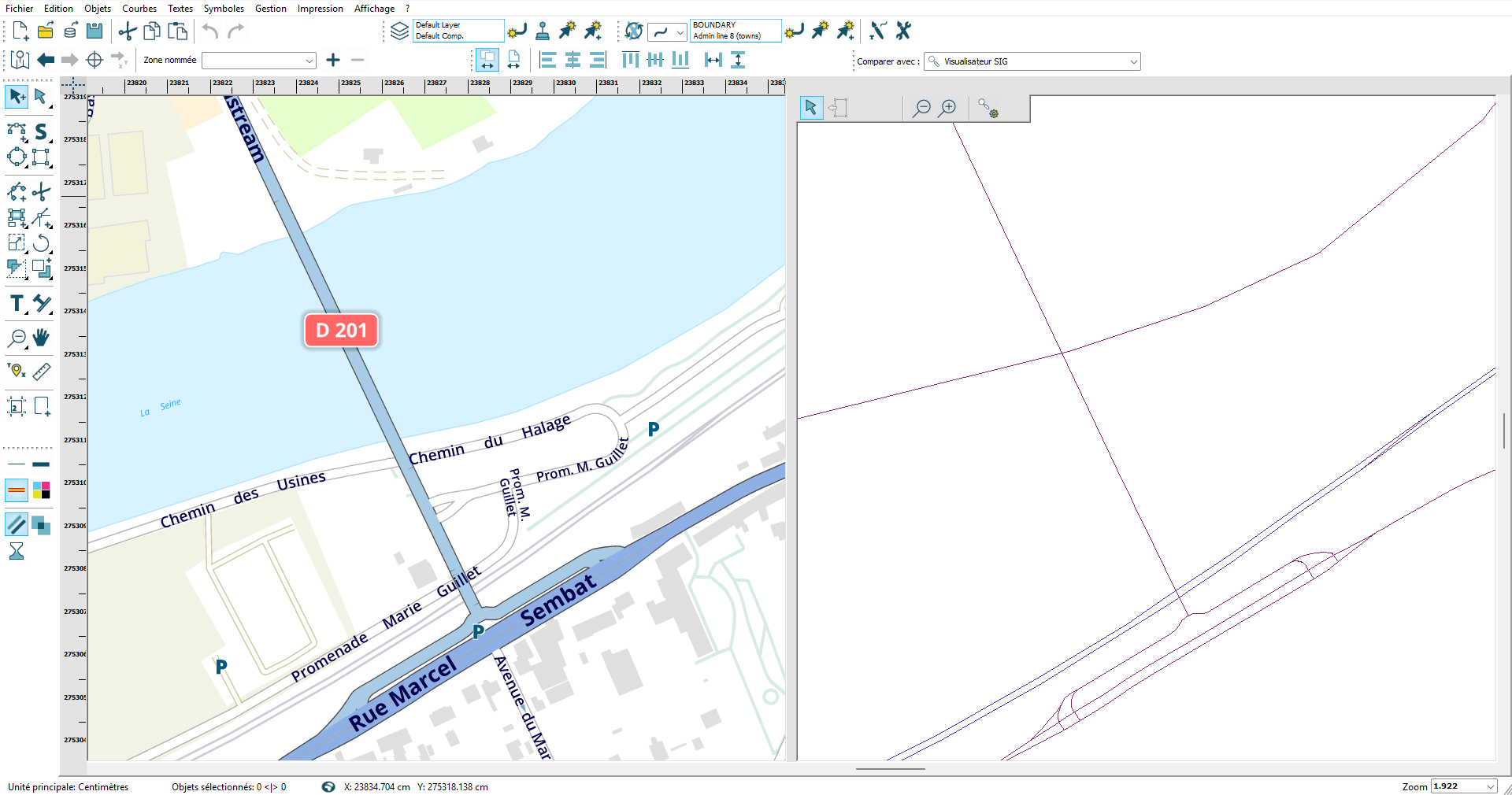 Il est également possible de comparer le document avec des données dans les principaux formats SIG ou directement lues à partir de base de données SIG (Postgres/PostGIS, Oracle) et dans n’importe quel système de coordonnées.
