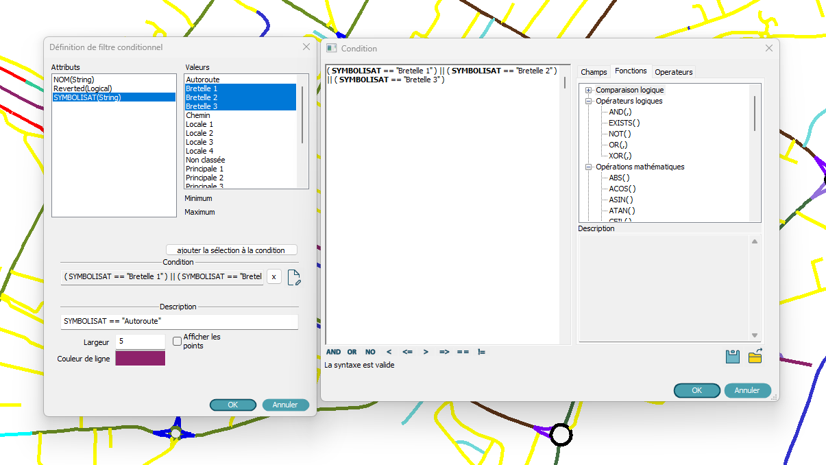 Pour les données SIG, le logiciel offre un outil de filtrage et d’habillage selon les attributs grâce à des conditions complexes sur les attributs des entités :
