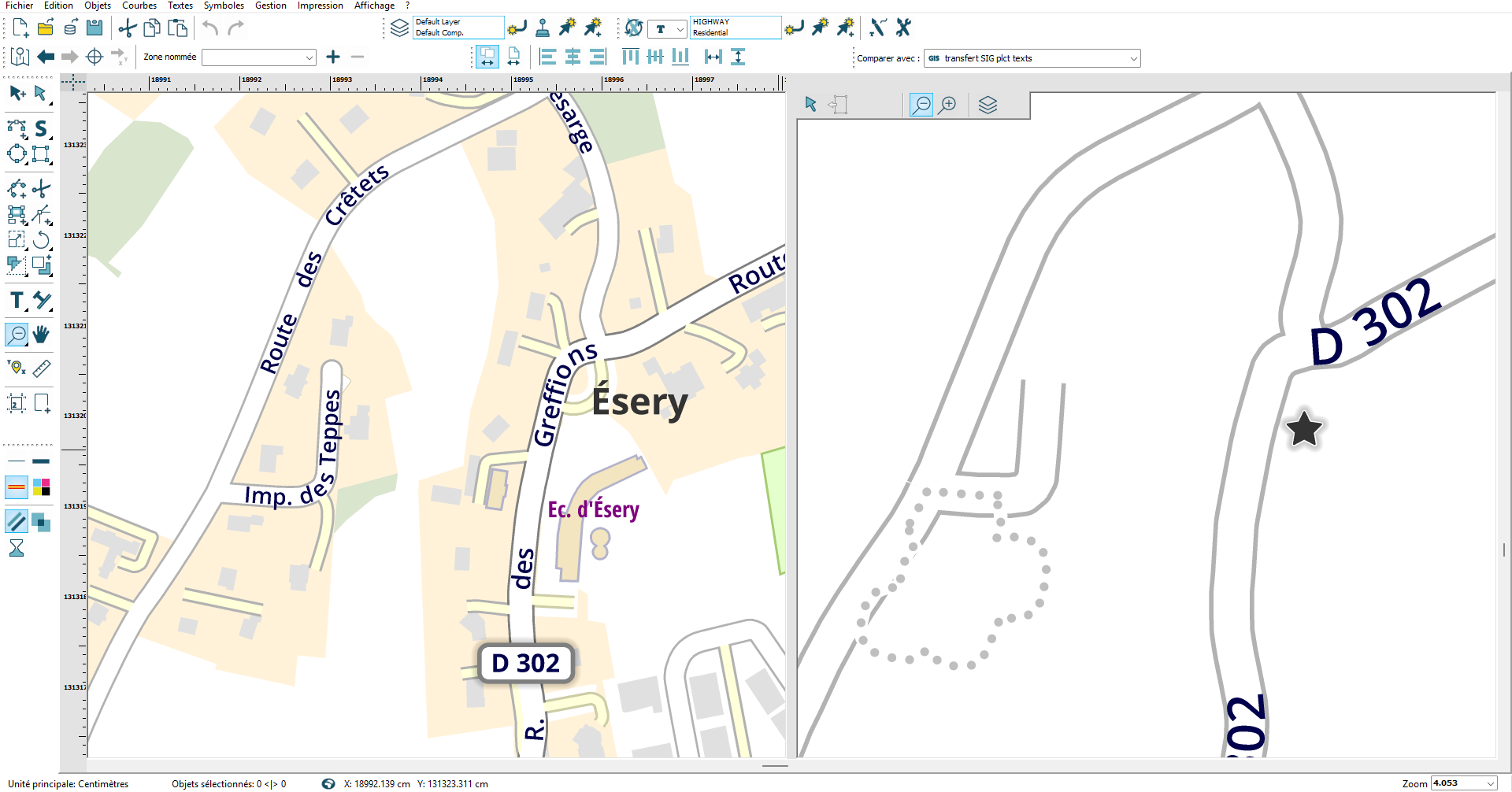 Il est possible de récupérer des entités du document de comparaison, en utilisant la symbologie du document en édition (identification par le nom) et après recalage à l’échelle, comme le montre l’exemple suivant :