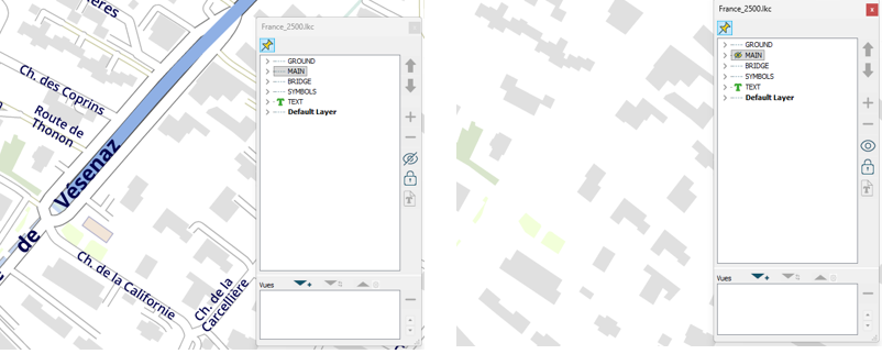 Ainsi on peut voir à a gauche la donnée de comparaison avec toutes les couches visibles, et à droite en masquant la couche contenant les routes.