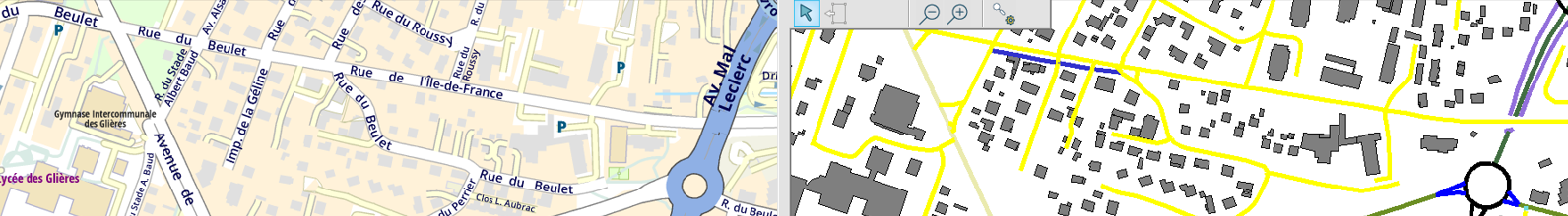 Dans l’exemple suivant, on compare à gauche une carte créée à partir des données OpenStreetMap et à droite on distingue les SHAPE des points, des surfaces de bâtiments et des routes provenant de données IGN.