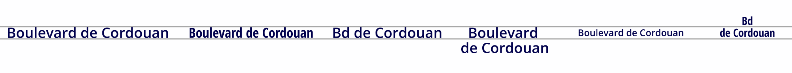 Dans l’exemple suivant, on peut identifier des textes abrégés, de police réduite, sur deux lignes, combinant plusieurs de ces modifications, le tout avec une répartition harmonieuse :