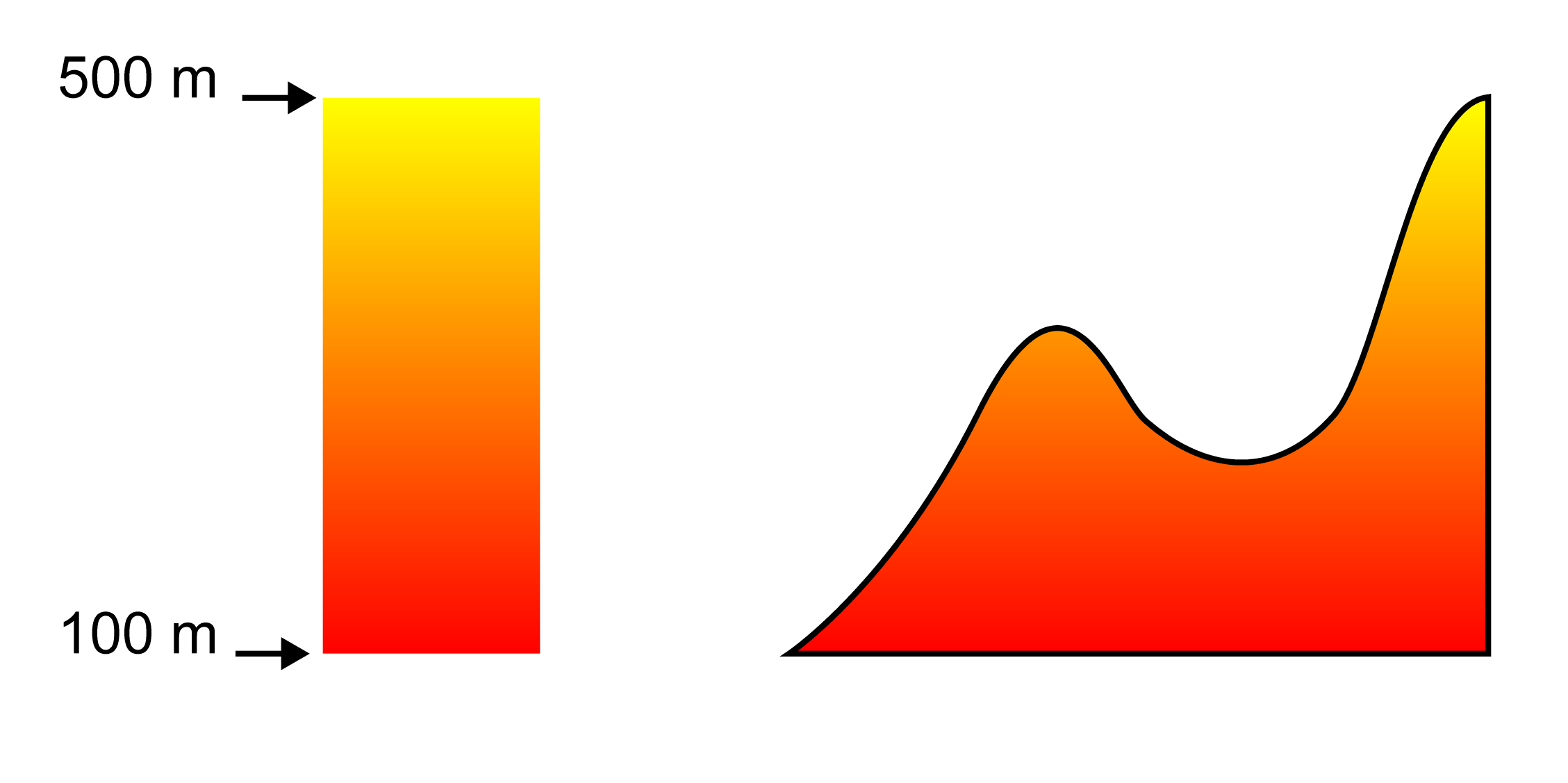 Beaucoup plus riche, cette représentation fait varier la couleur d’un point de l’image selon son altitude entre deux couleurs à définir, ainsi que l’explique ce schéma :