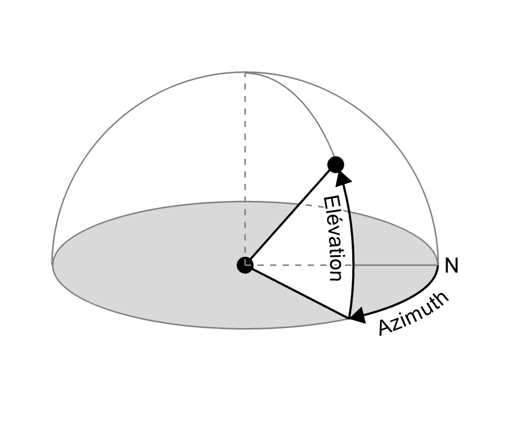 L’Elévation qui est l’angle vertical, et l’Azimuth, l’angle horizontal, tels que représentés dans le schéma suivant :