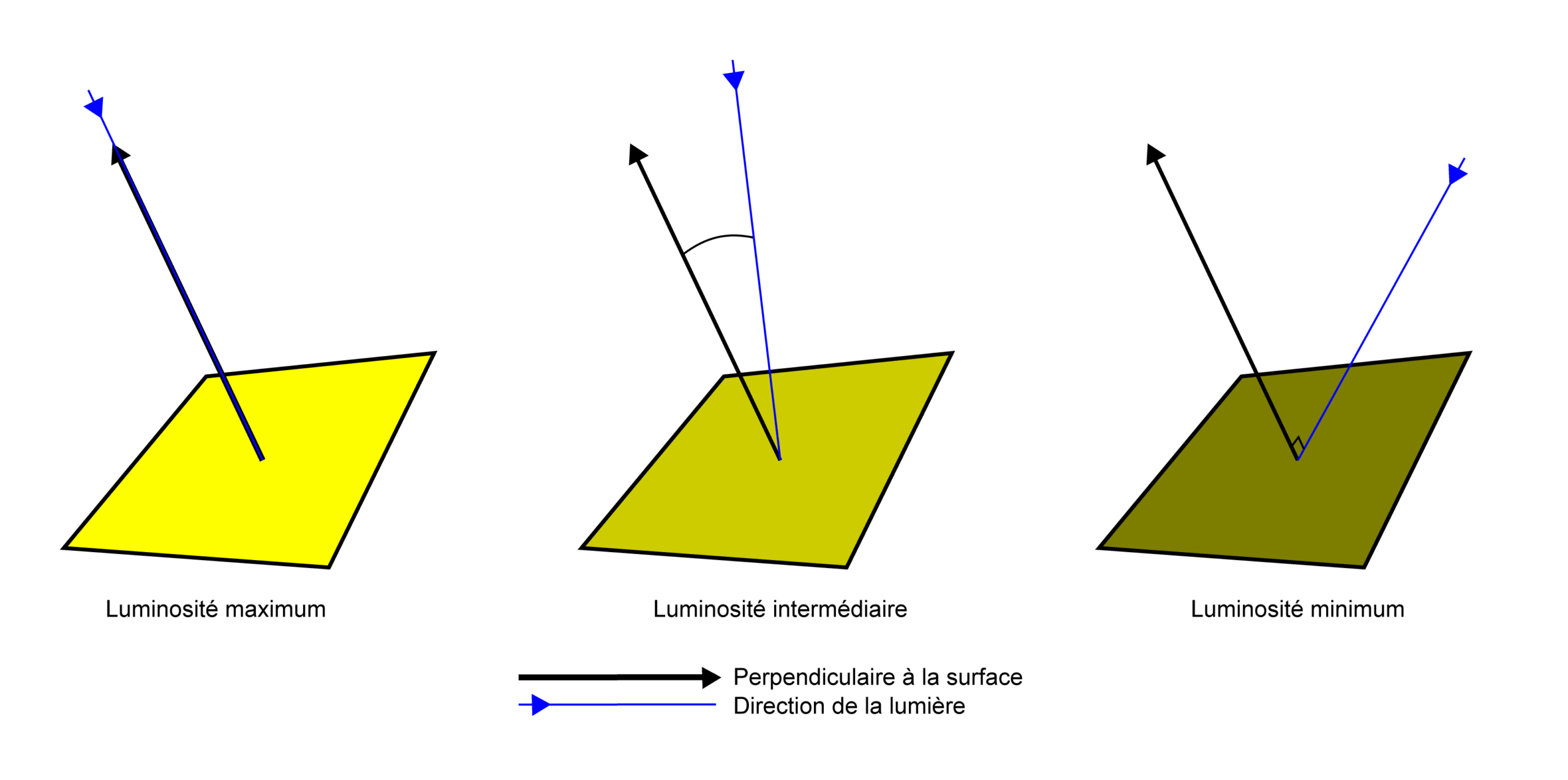 Elle se calcule aisément en chaque point. Plus la direction de la lumière est proche de la perpendiculaire à la surface, plus la luminosité est importante, comme illustré dans l’exemple suivant :