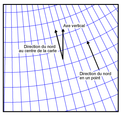 Ce dernier mode est très apprécié pour des surfaces étendues avec une projection ou le nord varie en chaque point comme illustré dans cet exemple utilisant une projection UTM :